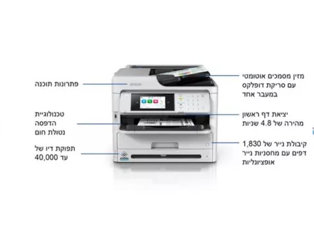מדפסת Epson WF-M5899DWF היא פתרון מושלם לעסקים, עם תפוקת דיו גבוהה של עד 40,000 דפים וקיבולת נייר של עד 1,830 גיליונות.
